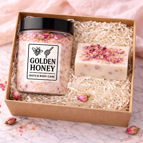 Each set includes a handcrafted Rose Vanilla Botanical Bar Soap—pure white and flecked with real rose petals—and a matching Rose Vanilla Bath Soak, infused with mineral-rich salts, skin-softening botanicals, and calming florals. Together, they transform your bath into a quiet ceremony of care, presence, and devotion.