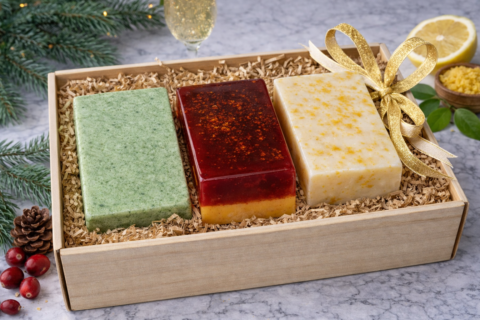 Celebrate the magic of the holidays with the Golden Holiday Soap Gift Set—a beautifully curated collection of three handcrafted soap bars inspired by the scents of the season. From fruity sparkle to cozy sweetness to fresh winter woods, this set offers a luxurious bathing experience that delights the senses and nourishes the skin. Perfect for gifting or indulging in your own holiday self-care ritual.